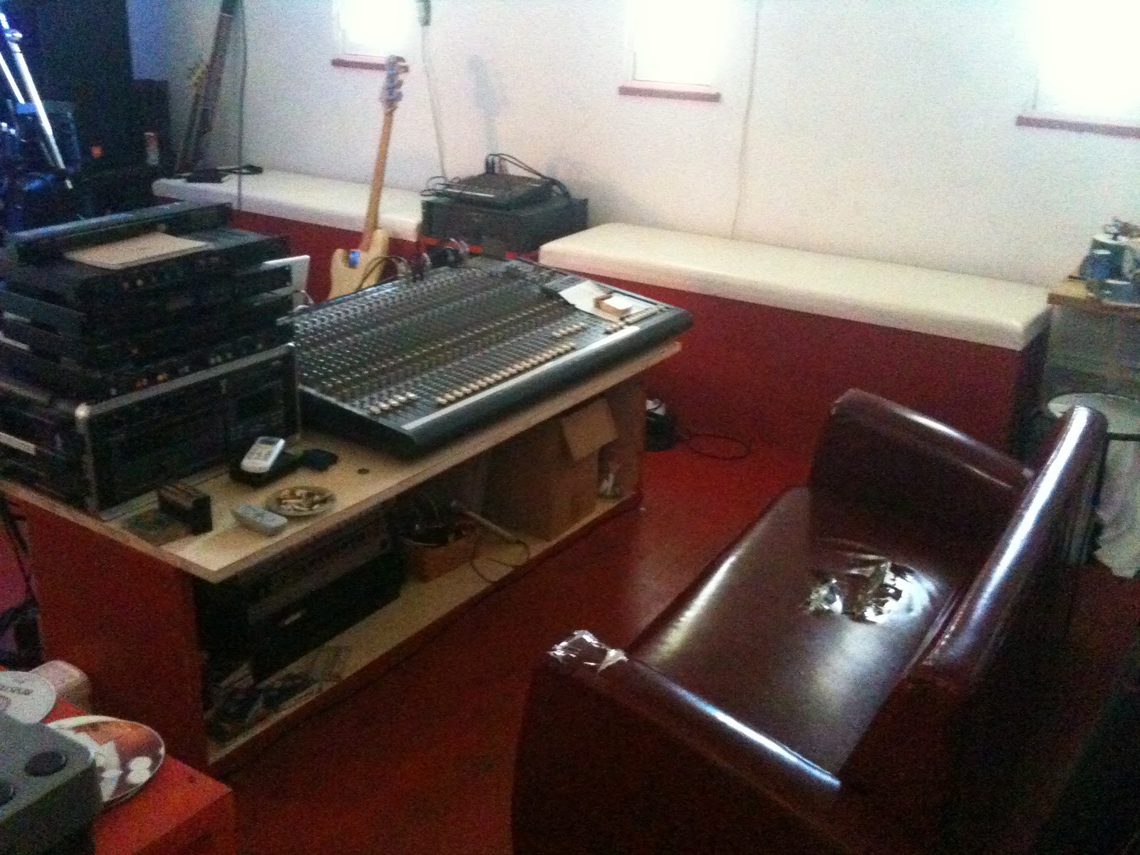 The sight from drum set is like this.Face directly to mixing console.I normally record drums at first,So first play is much important deciding direction of the track.